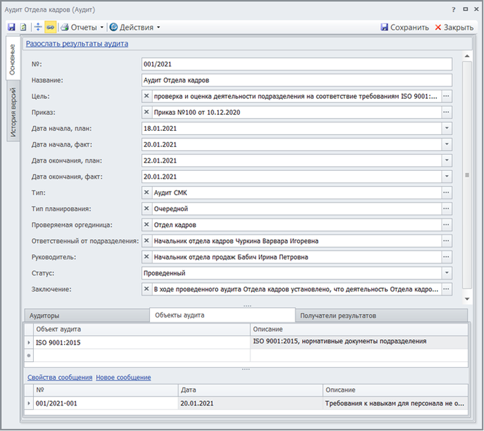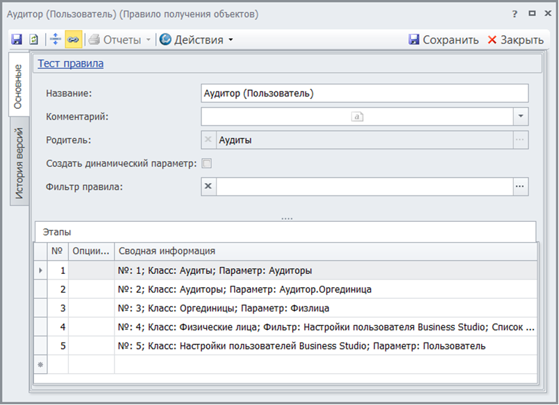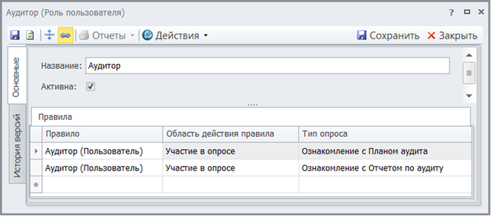 Например, создать Роль пользователя «Аудитор» — это лицо, которое указано на вкладке «Аудиторы» в свойствах аудита.