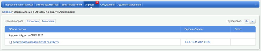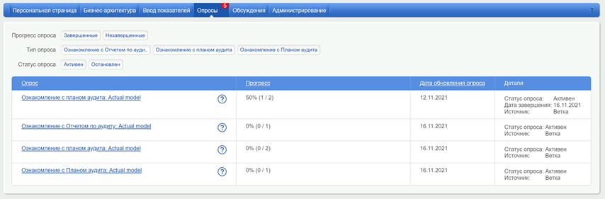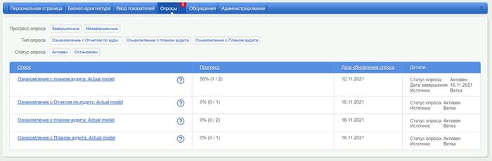 Рассмотренные выше механизмы работы с аудитами в Business Studio, были доступны еще в версии 4.2. Осенью 2020 года вышла версия Business Studio 5.0, в которой появился механизм Опросов.