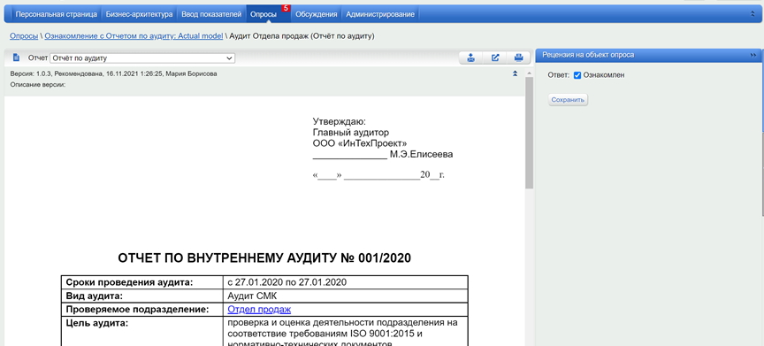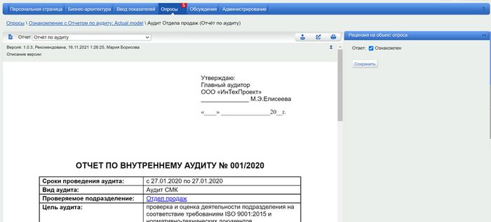 Данный механизм позволит ознакомить аудиторов и ответственного от подразделения (которые заявлены в карточке аудита) с Планом проведения аудита, а после проведения аудита — с Отчетом по проведенному аудиту. Подробнее про опросы можно почитать тут.