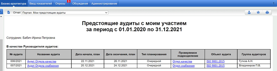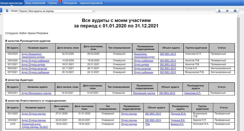 Помимо этих отчетов для Пользователей Портала можно создать персонифицированные отчеты по аудитам, которые доступны на Персональной странице пользователя в разделе аудиты (этот раздел можно создать самостоятельно в Настройках Портала). Примеры отчетов: