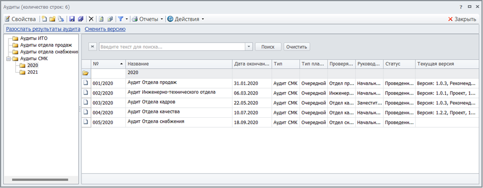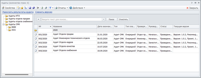 Справочник аудитов является иерархическим, т. е. в нем можно создавать различные папки, чтобы классифицировать аудиты, например, по видам и по годам: