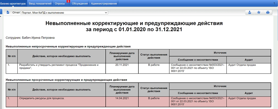 Рис. 18. Отчет «Выполнение корректирующих и предупреждающих действий»