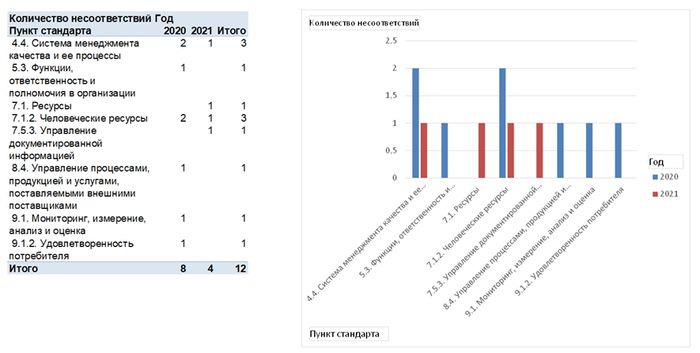 Рис. 23. Сводная таблица и диаграмма «Несоответствия по пунктам стандарта по годам»