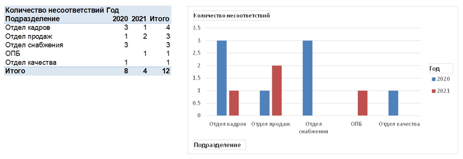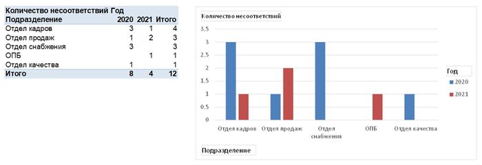 Второй отчет для Совета по качеству — Несоответствия по подразделениям. Он показывает, сколько несоответствий было обнаружено в каждом из подразделений. Также формируется сводная таблица и сравнительная диаграмма по этой таблице.