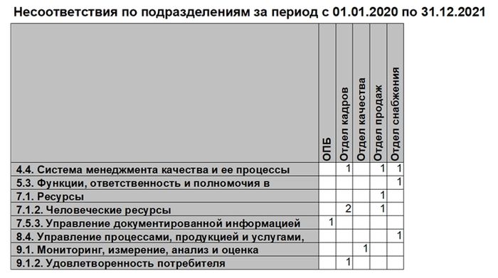 Третий отчет — шахматка, которая показывает сколько несоответствий было выявлено в каждом подразделении по каждому пункту стандарта ИСО: