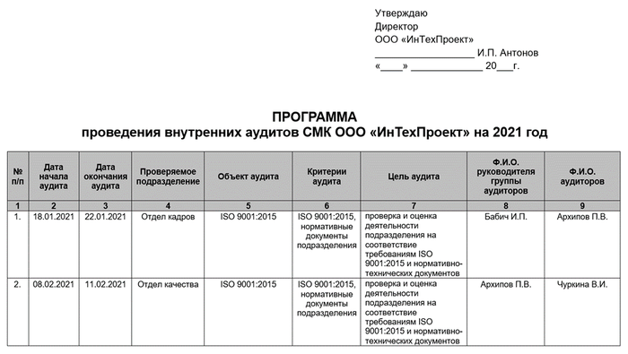 Все аудиты в Компании обычно проводятся на основе составленной программы аудитов на год. Если же в Компании проводятся не только аудиты СМК, но и другие проверки, то для каждого вида таких проверок создается своя программа.