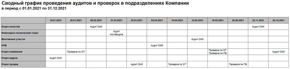 И, конечно же, желательно потом совместить программы по всем проводимым проверкам и составить сводный график проведения всех аудитов и проверок в Компании, чтобы для проверяемых подразделений не было сюрпризов по проведению какой-либо проверки. Также это предотвратит проведение нескольких видов проверок в одном подразделении в один месяц: каждое проверяющее подразделение сможет сопоставить свой план с общим графиком и внести корректировки, если потребуется.