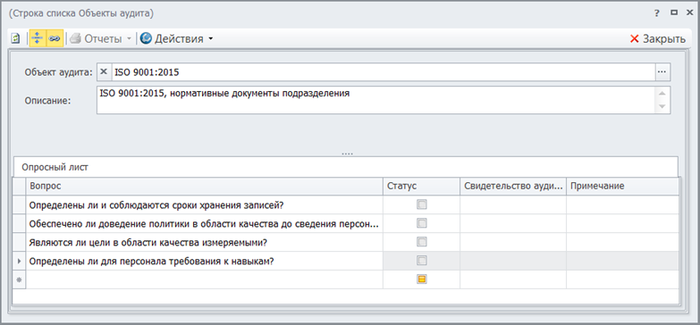 Вопросы для опросного листа хранятся в соответствующем справочнике (который тоже создается в MetaEdit), поскольку вопросы могут повторяться при проведении разных аудитов.