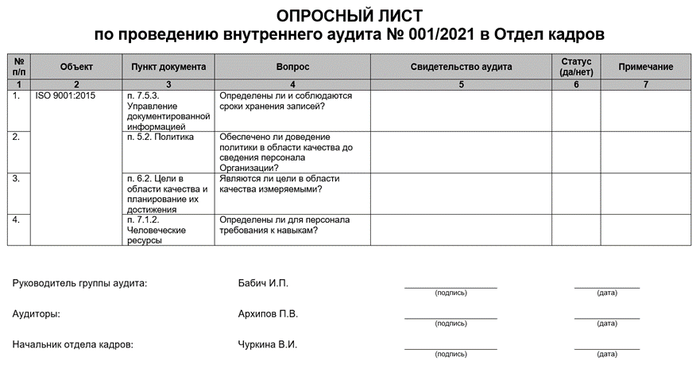 На стадии подготовки к аудиту опросный лист может быть распечатан пустым, с ним аудиторы пойдут в проверяемое подразделение, заполнят его вручную, а затем информацию необходимо внести в BS.