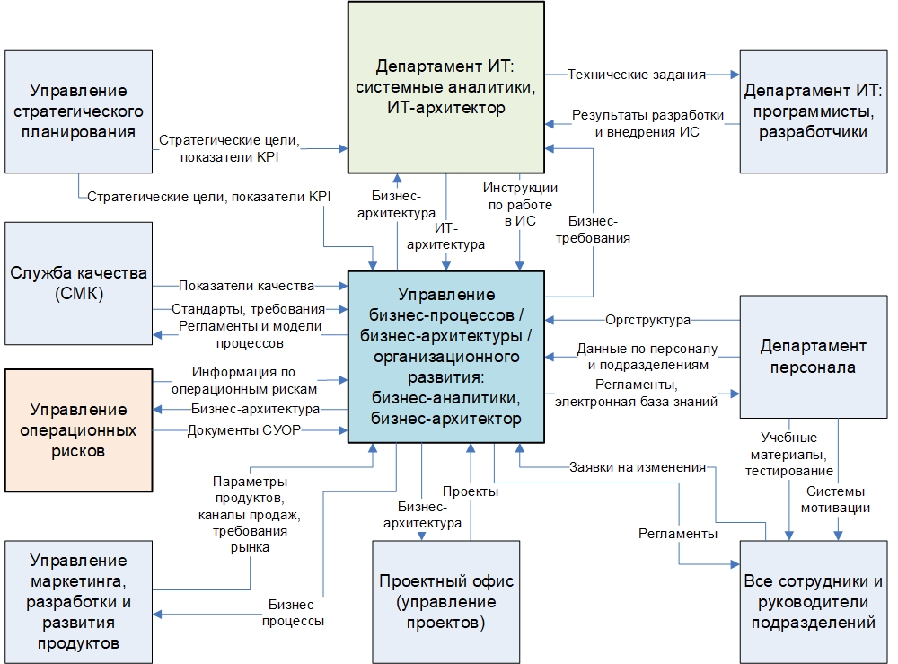 - задачи и коммуникации с Департаментом ИТ по взаимосвязи бизнес-архитектуры и ИТ-архитектуры организации