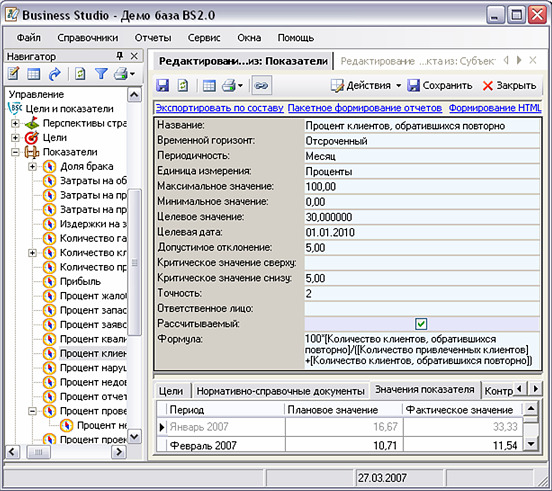 В системе Business Studio 2.0 содержание краткосрочных планов детализируется по периодам (кварталам, месяцам, неделям, дням) и выражается в виде плановых значений показателей. Показатели и их целевые значения (значения, которые планируется достичь), предоставляют менеджменту своевременные сигналы, основанные на отклонениях реального положения вещей от планового,