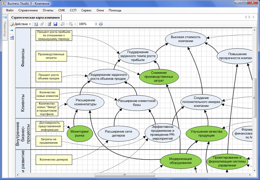 Business Studio позволяет построить для любого предприятия сбалансированную систему показателей (ССП) и работать с ней в режиме реального времени. Так, например, главной целью развития предприятия является увеличение прибыли на заданное количество процентов за ближайшие 3 года. Стратегическая карта показывает, каких промежуточных целей следует достичь для этого. Каждая из целей получает свой набор показателей, которых и следует добиваться в процессе развития. Показатели могут быть любыми — от количества стажеров, получивших допуск к самостоятельной работе, до процента удовлетворенных клиентов от общего их числа. Единственное требование — показатели должны быть измеримыми, каждый из них должен быть выражен