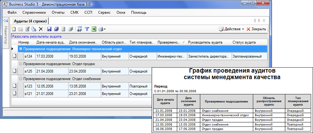 В системе Business Studio можно планировать аудиты, получать график аудитов на основе составленного плана, фиксировать результаты проведенных аудитов и формировать отчеты по этим результатам (Рис. 6).