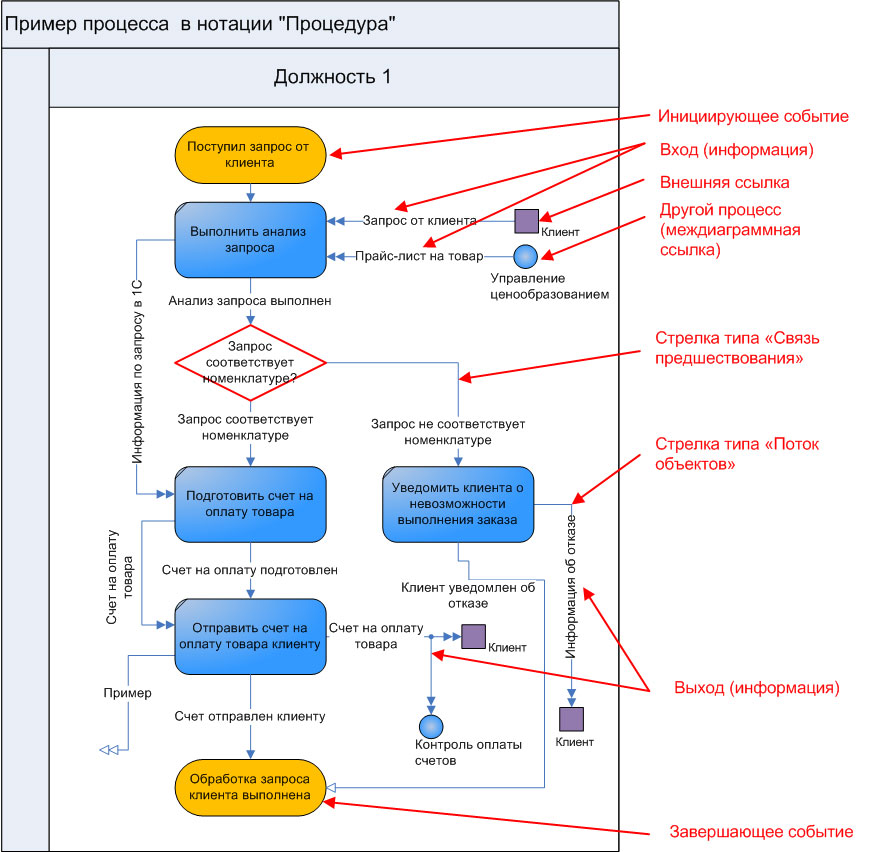 Заметим, что стрелки типа «Связь предшествования» можно не именовать. Но автор статьи придерживается стиля, при котором такие стрелки именуются в терминах событий, например: «Запрос не соответствует номенклатуре», «Счет на оплату подготовлен». Это делается исключительно с целью повышения визуальной наглядности схемы для пользователей.