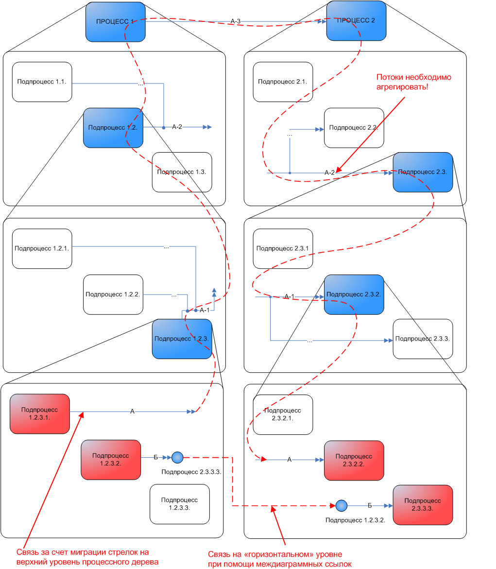 Если необходимо увязать между собой подпроцессы, которые входят в модели верхнего уровня и не связаны между собой (например, находящиеся в разных папках), то удобно использовать междиаграммные ссылки. Вопрос выбора наиболее подходящего метода является не таким простым, как кажется. Если, например, мы ходим увязать между собой два подпроцесса, находящиеся каждый на четвертом уроне процессного дерева в разных «ветках», то: