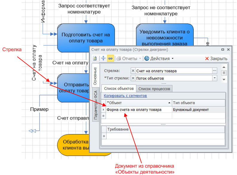 Рис. 5. Смысл привязки документов к стрелкам в Business Studio