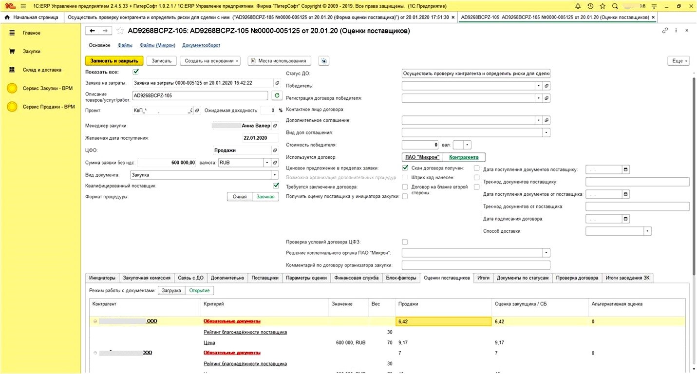 Аналогично отрабатывались все остальные ответственные контролеры-согласователи, в числе которых служба безопасности. Нам нужно было сдвинуть фокус их участия с самого контракта в предконтрактную фазу, где определялся контрагент. Мы создали им условия для рейтингования и оценки коммерческих предложений поставщиков по критерию благонадежности, разработали шкалу, автоматизировали рабочее место в ERP. Для них это был прорыв.