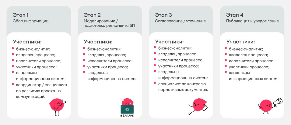 Порядок работы бизнес-аналитиков с процессами включает четыре этапа.