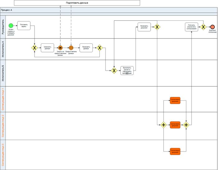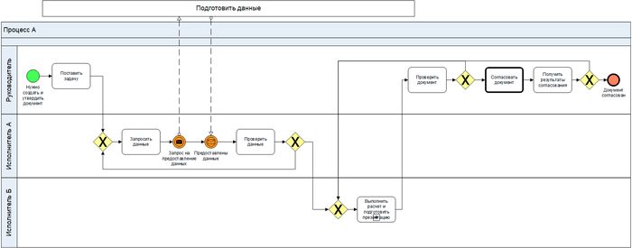 Измененная модель показана на рис. 5. Исполнитель А выполняет задачу «Запросить данные». После нее показано промежуточное событие «Запрос на предоставление данных», которое инициирует на выполнение процесс «Подготовить данные». Он показан в виде свернутого пула над схемой. От события к нему проведена стрелка типа Message Flow.