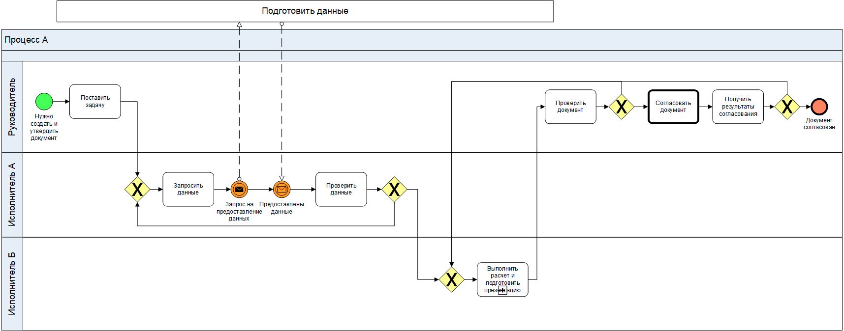Задача «Согласовать документ» на дорожке Руководителя — это типовой (повторно выполняемый) процесс. В терминах Business Studio — это процесс-ссылка.