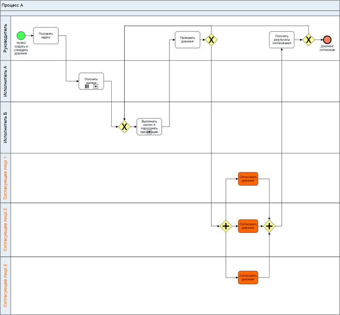 На схеме Процесса А удалим группу задач согласования (овал № 3) и соответствующие дорожки, закроем схему, скопируем в навигаторе процесс «Согласовать документ» и вставим его как задачу в Процесс А, обязательно используя опцию «Вставить как ссылку», откроем схему Процесса А на редактирование и внесем необходимые изменения. На рис. 11 показана готовая схема Процесса А.
