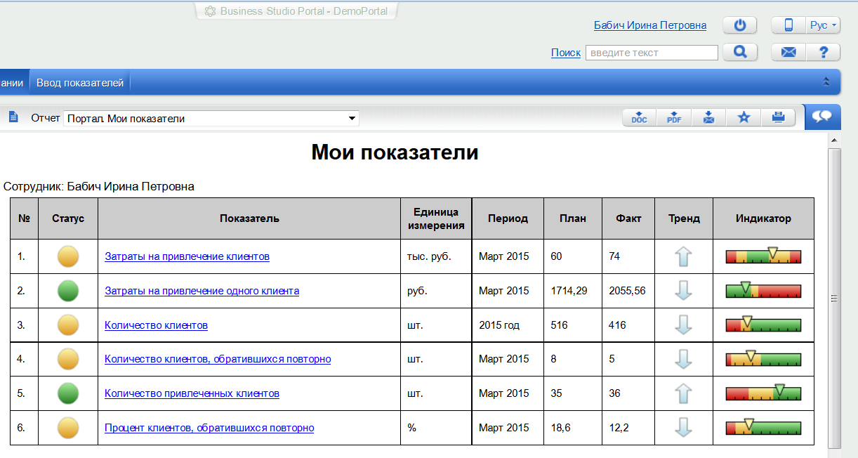 Рис. 4. Контроль показателей KPI с помощью Бизнес-портала