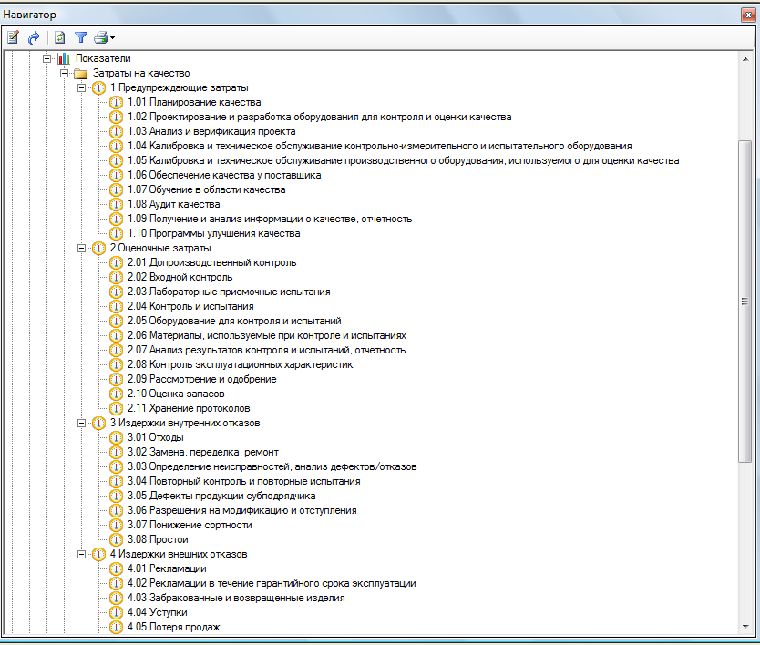 После того как все эти данные получены, необходимо занести их в Business Studio. Для этого в соответствующем разделе «Показатели» создаём папку «Затраты на качество», в которой размещаем иерархический справочник затрат на качество (Рисунок 4), где каждому элементу затрат соответствует определенный