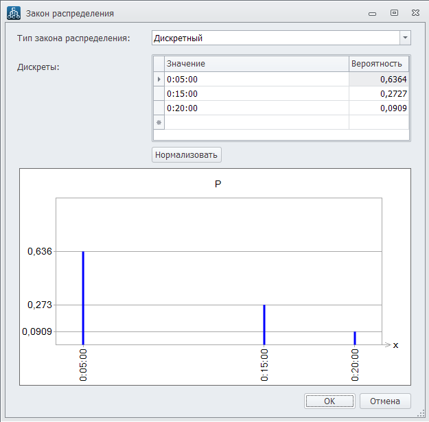 Обратим внимание, что время выполнения первой операции процесса «Оформить оперативную заявку» не является константой. Около 64% всех заявок оформляется 5 минут. В 27% случаев необходимо собирать данные для заявки, а это занимает 15 минут. В 9% случаев сбор данных занимает 20 минут.