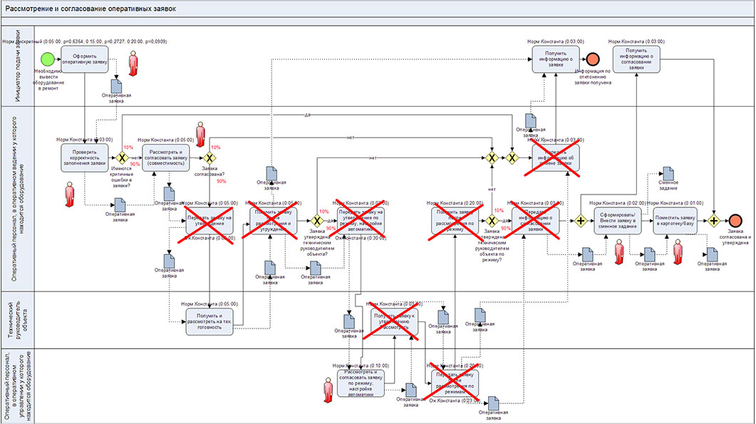 На схеме процесса (см. рис. 1) красным цветом показана вероятность перехода по соответствующим стрелкам после шлюзов. Так, например, переход по стрелке «да» после шлюза «Имеются критичные ошибки в заявке?» будет осуществляться с вероятностью 80%