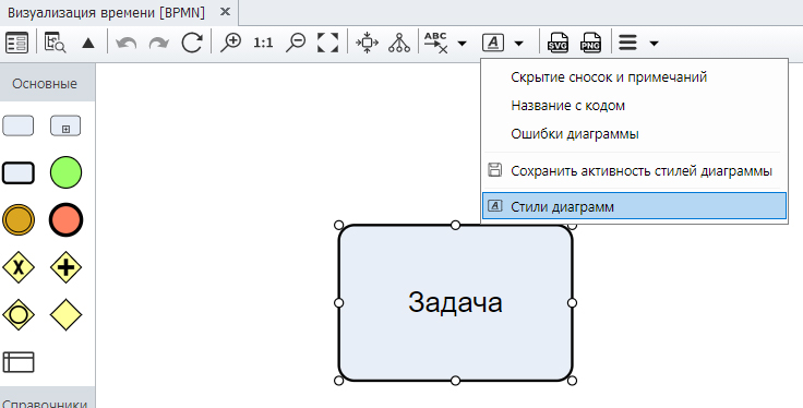 Далее нужно закрыть все окна (кроме модели процесса) и в верхнем меню открыть выпадающий список «Стили» и выбрать «Стили диаграмм», как показано на рис. 11.