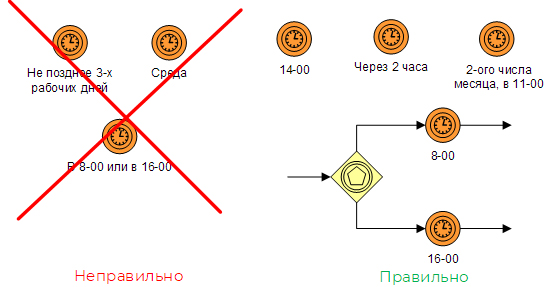 Некоторые процессные аналитики всерьез полагают, что красивые «часики» специально сделаны для того, чтобы визуализировать нормативное или предельное время выполнения задач процесса. Это заблуждение. Если вы видите такое использование таймеров на модели, то это означает, что ее автор не знает нотацию BPMN.