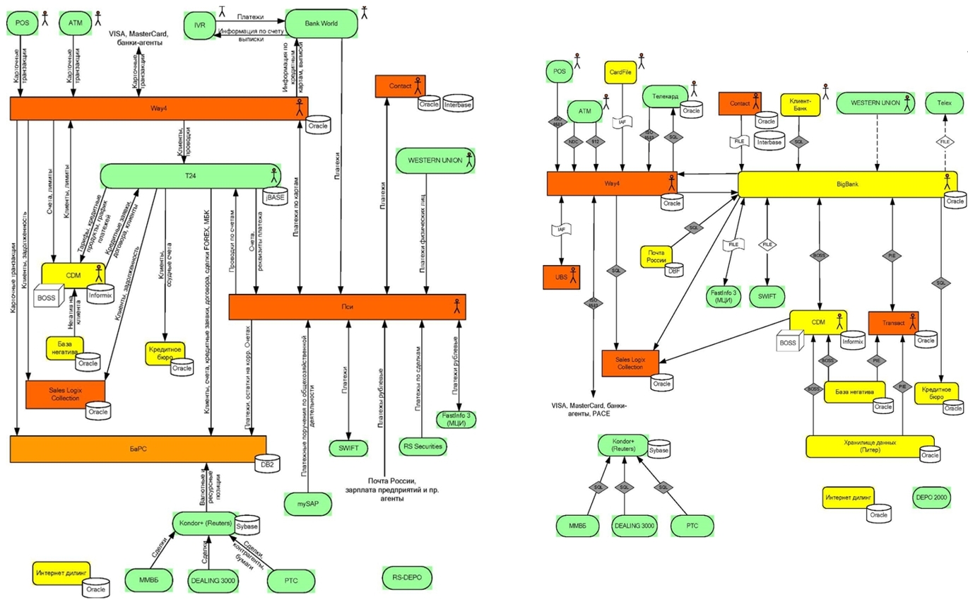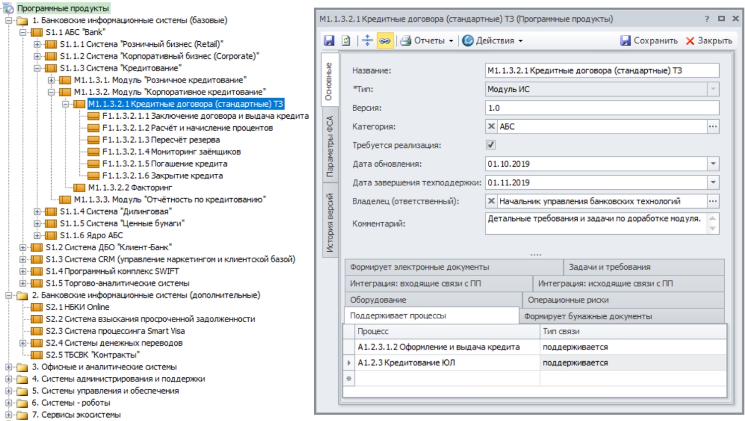 Рис. 5. ИТ-архитектура на примере банка (фрагмент, верхний уровень) и пример карточки (набора параметров) ИТ-системы