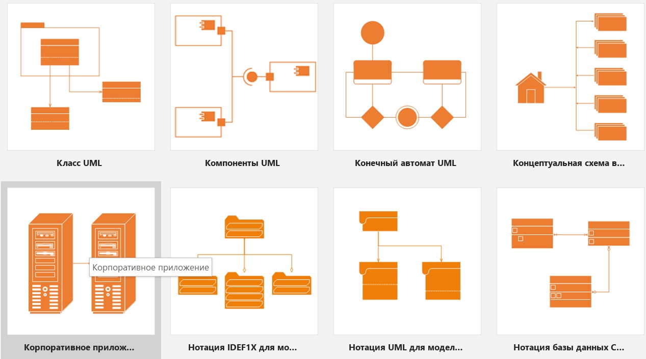 Рис. 7. Примеры ИТ-моделей, создаваемые в Microsoft Visio (шаблоны категории «Программы и базы данных»)