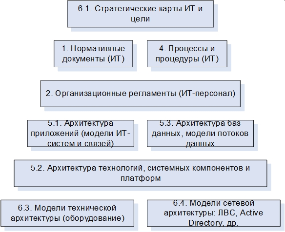 Если рассмотреть ИТ-архитектуру в широком понимании, то на основе компонентов из Рис. 1. все модели и документы можно разделить на 6 уровней (Рис. 8), между которыми существует большое количество разносторонних связей и влияний. Основное влияние идёт сверху вниз. На основе стратегии ИТ разрабатываются (актуализируются, оптимизируются) процессы и процедуры, нормативные документы верхнего уровня. Для исполнения процессов и процедур формируется ИТ-персонал (организационная структура, системы мотивации, корпоративная культура и т. п.). Далее выполняется проработка архитектуры приложений и баз данных, которые автоматизируют процессы и процедуры. Параллельно строится архитектура технологий, системных компонентов и платформ, на которых работают приложения. Последний уровень — физический, т. е. техническая и сетевая архитектура.