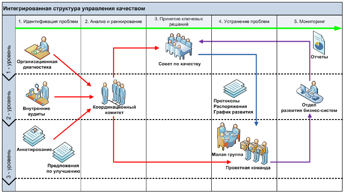Подсистему управления качеством поддерживает интегрированная структура управления качеством, включающая в себя три уровня управления (Рис. 4):
