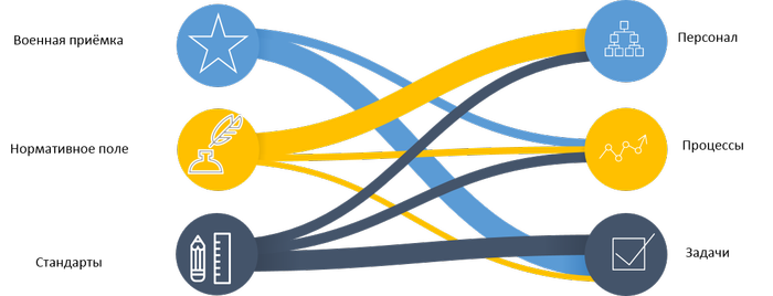 Разработка, производство и обслуживание такого рода изделий строго регламентировано ГОСТ, ОСТ и различными нормативными документами. Контроль соблюдения этих нормативов осуществляется как внутренними службами организации, так и военной приёмкой. Более того, хотя концепция «Бережливого производства» говорит об избыточности функции контроля, о том, что она не приносит ценность конечному потребителю, система производства на таких предприятиях настроена на многоступенчатый контроль, что в некоторых случаях может приводить даже к перегибам, когда контролер становится ответственным за выпуск продукции, вместо самого производителя. В реальных условиях отойти от подобной практики сложно, так как она пронизывает как жизненный цикл изделия от разработки до утилизации, так и цепочки поставок (кооперации) при производстве подобных изделий. Это приводит к возникновению «многомерности» различных обязательных требований и условий (Рис. 1), которые оказывают влияние и непосредственно на производство, и на управление предприятием в целом, существенно усложняя процессы, которые в других условиях могли бы быть достаточно простыми.