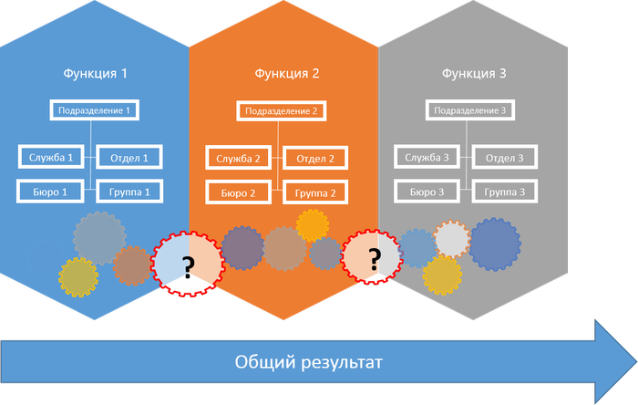 Когда же необходимость в горизонтальном взаимодействии между «бункерами» все-таки объективно возникает, то «бункеры», отрабатывая свое название, занимают позицию бескомпромиссной обороны. И место эффективного взаимодействия занимают бесконечные споры о том, кому из «бункеров» следует выполнить ту работу, которую они не могут разделить между собой (см. Рис. 2).