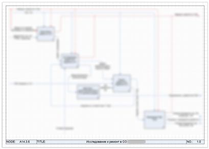 На первом этапе было проведено обучение системе Business Studio 45 сотрудников в разных отделах. Это помогло не только визуализировать процессы и убрать «бутылочное горлышко» с отдела качества, как «отрисовщика процессов», но и получить «агентов влияния» в распространении процессного подхода. Описание процессов дало возможность увидеть иерархичность процессов — процессов верхнего уровня (для них сразу нашлось применение нотации IDEF0) и процессов более низкого уровня, для которых используется нотация «процедура». Такой подход позволил наглядно показать, как работает матричная структура управления, когда для выполнения той или иной функции необязательно, чтобы сотрудники находились в подчинении у одного руководителя. Это продемонстрировано на Рис. 3, где представлена процедура проведения испытаний отремонтированного изделия, в которых участвуют различные отделы, подчинённые разным функциональным подразделениям, а вся процедура является частью процесса ремонта, Рис. 4.