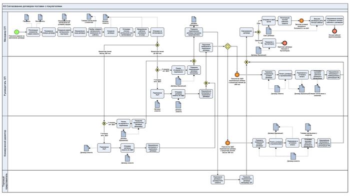 Бизнес-процесс оформления договорных отношений с заказчиком описывает и регламентирует все возможные варианты развития событий от обращения потенциального клиента в компанию «Кормовит» до момента, когда ему дают доступ в личный кабинет. Этот сценарий был формализован в графическом виде — последовательная цепочка выполнения определенных действий и наступления событий, при которых бизнес-процесс заключения договора завершается успешно, либо предусмотрены ситуации, когда необходима корректировка процесса по оформлению договорных условий.