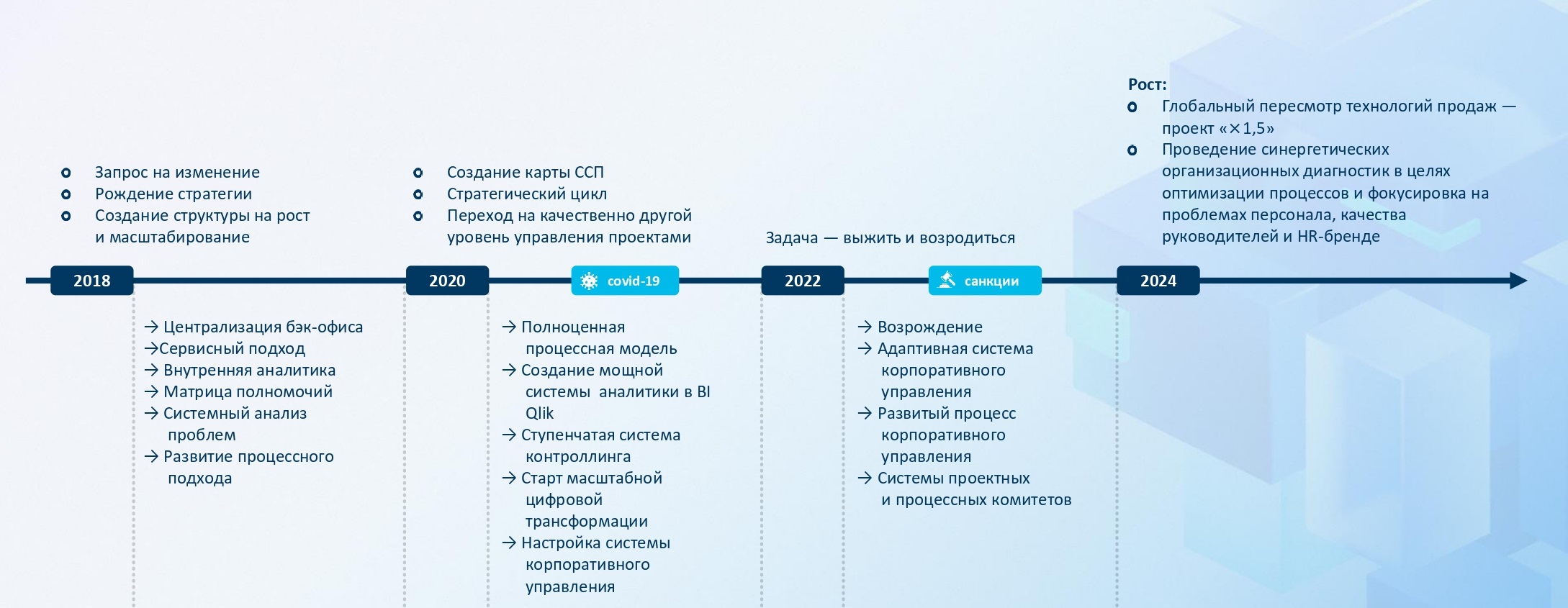 Ключевой вехой в развитии компании стал 2018 год, когда собственник решил масштабировать бизнес. Так начался наш путь организационной трансформации, появилась первая стратегия и структура компании, рассчитанная на рост масштабов бизнеса.