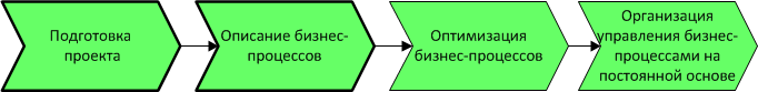 Методика состоит из двух этапов (см. рис. 2): подготовка проекта, описание бизнес-процессов. Первый этап по времени может занимать до 2-х месяцев, второй этап — до 10 месяцев, в сумме — 1 год. Точные сроки зависят от большого количества факторов и специфики конкретного банка.