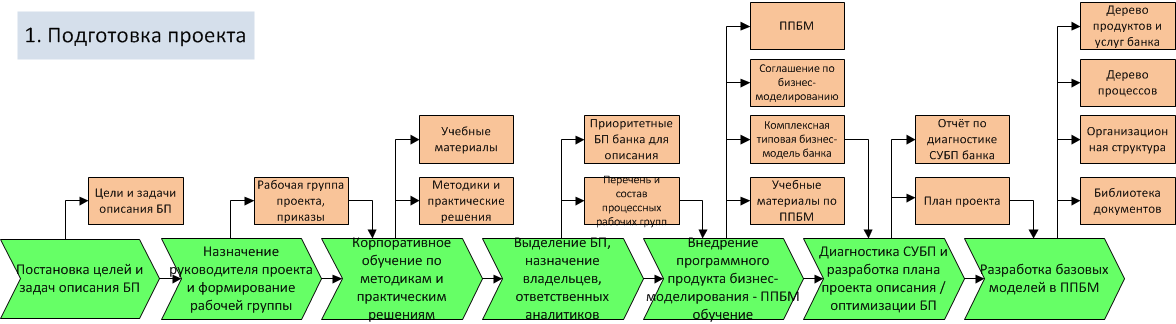 - Разработка базовых моделей в ППБМ. Они включают: дерево продуктов и услуг банка, дерево процессов, организационная структура банка, библиотека документов др. Примеры всех моделей представлены в [1] и [2].