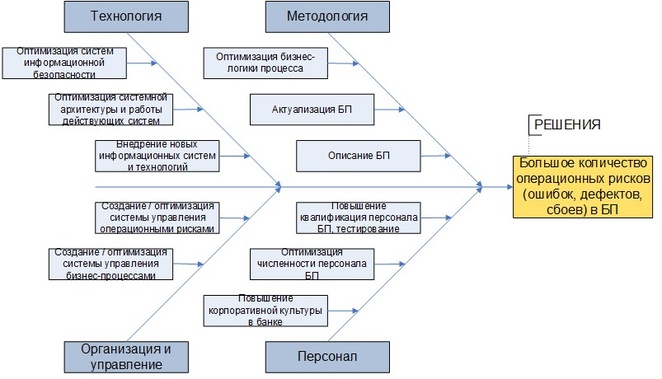 Для анализа причин проблем в бизнес-процессе применяется метод «Cause and Effect Diagram» (диаграмма причин-следствий, или диаграмма Исикавы, или диаграмма мозгового штурма). Рабочая группа на основе собственного экспертного опыта, различных материалов и документов разрабатывает 2 модели: карта причин (см. Рис. 3) и карта решений (см. Рис. 4). Они удобны для систематизации, наглядного отображения и коллективного обсуждения причин (решений) по бизнес-процессу. Следует отметить, что это не просто поверхностные модели. Внутри каждого изображённого на модели прямоугольника (причины или решения) находится большой набор атрибутов (детальные планы действий, комментарии, список ответственных и т. п.). Для разработки этих и других бизнес-моделей предназначены специальные системы бизнес-моделирования (например, Business Studio и Microsoft Visio).