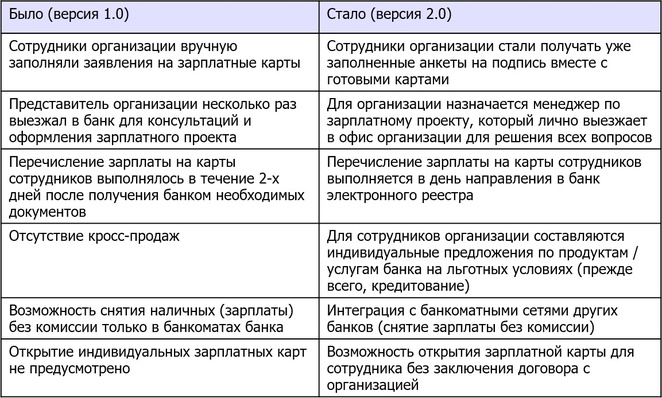 Пример оптимизации бизнес-процесса «Зарплатные проекты» (от версии 1.0 к версии 2.0) показан в Табл. 1.