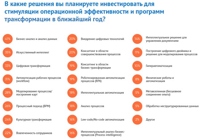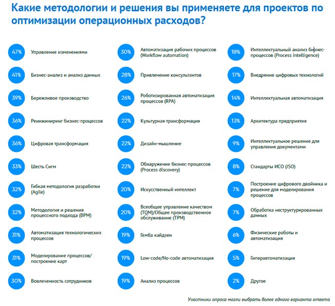 В целом, общий список рис. 2 выглядит довольно странно – смешаны концептуальные подходы (например, BPM), методы (например, моделирование процессов) и инструменты (например, RPA). Но интересно отметить, что бережливого производства, как метода, в который нужно инвестировать деньги, в списке нет. Возможно, Lean уже считается стандартным элементом системы управления, находящимся на достаточном уровне эффективности.