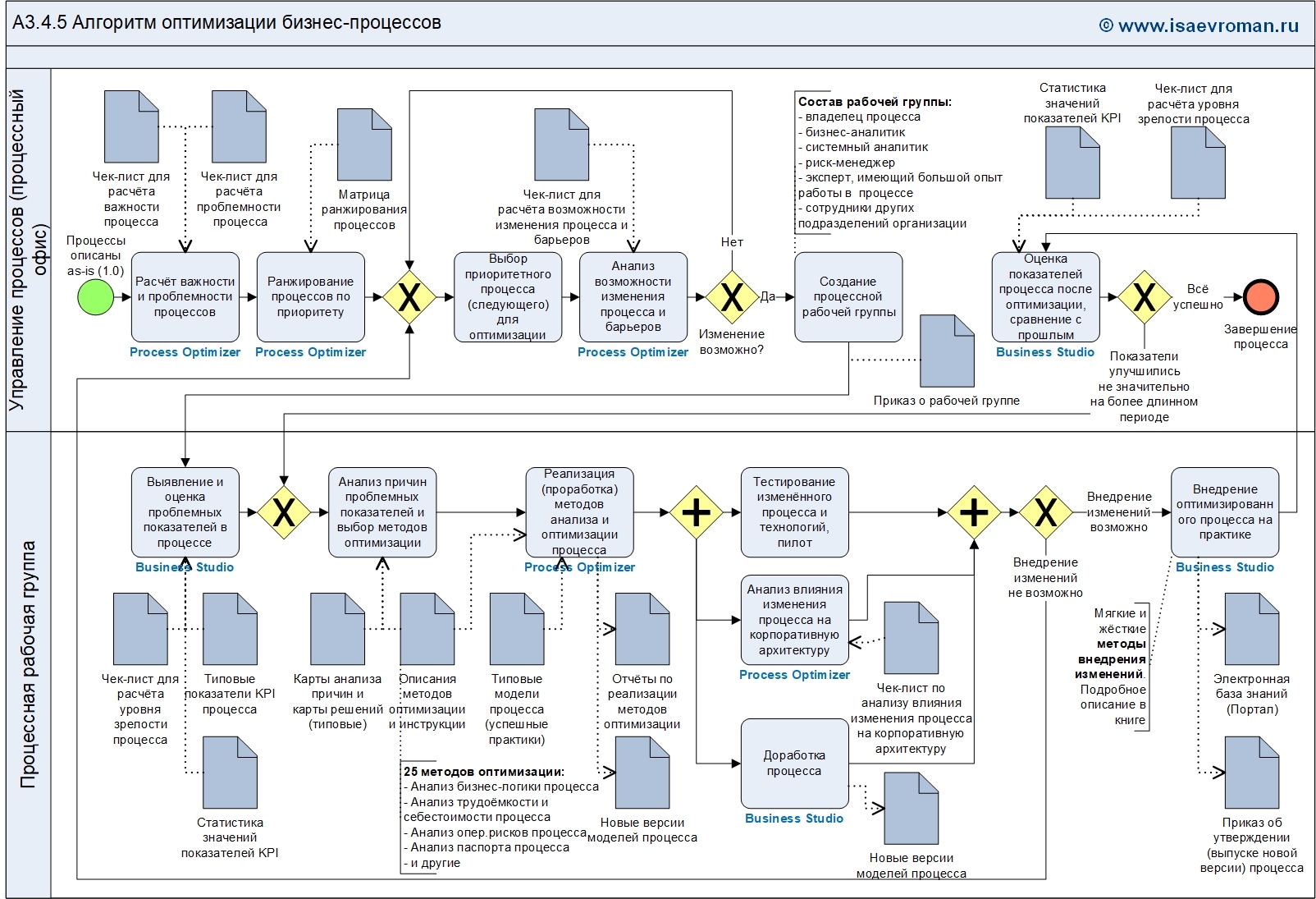 Работа по оптимизации и актуализации процессов не является разовой или временной, а должна выполняться постоянно. Поэтому необходима команда квалифицированных бизнес-аналитиков (процессный офис или управление процессов) и активное участие сотрудников подразделений в процессных рабочих группах. Именно участники (исполнители) процессов, которые в течение многих лет их выполняют, знают все особенности и секреты, могут дать экспертное мнение, что и как лучше оптимизировать в процессе. А профессиональные программные продукты бизнес-моделирования (например, Business Studio) и современные методы (алгоритмы) оптимизации помогут это сделать правильно и системно.