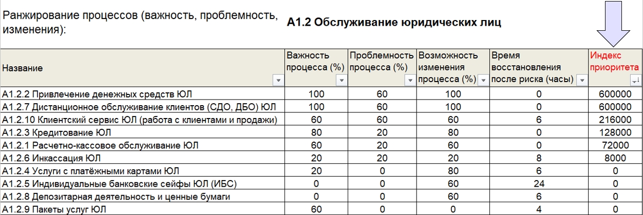 Рис. 2. Матрица ранжирования процессов (фрагмент)