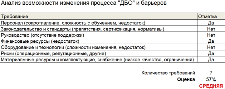 Выполняется на основе большого количества факторов по специальному чек-листу, фрагмент которого приведён на Рис. 3 Если чек-лист покажет высокий уровень барьеров (т.е. низкую возможность изменения процесса), тогда оптимизация процесса отменяется (или откладывается) и идёт возврат на задачу №3.