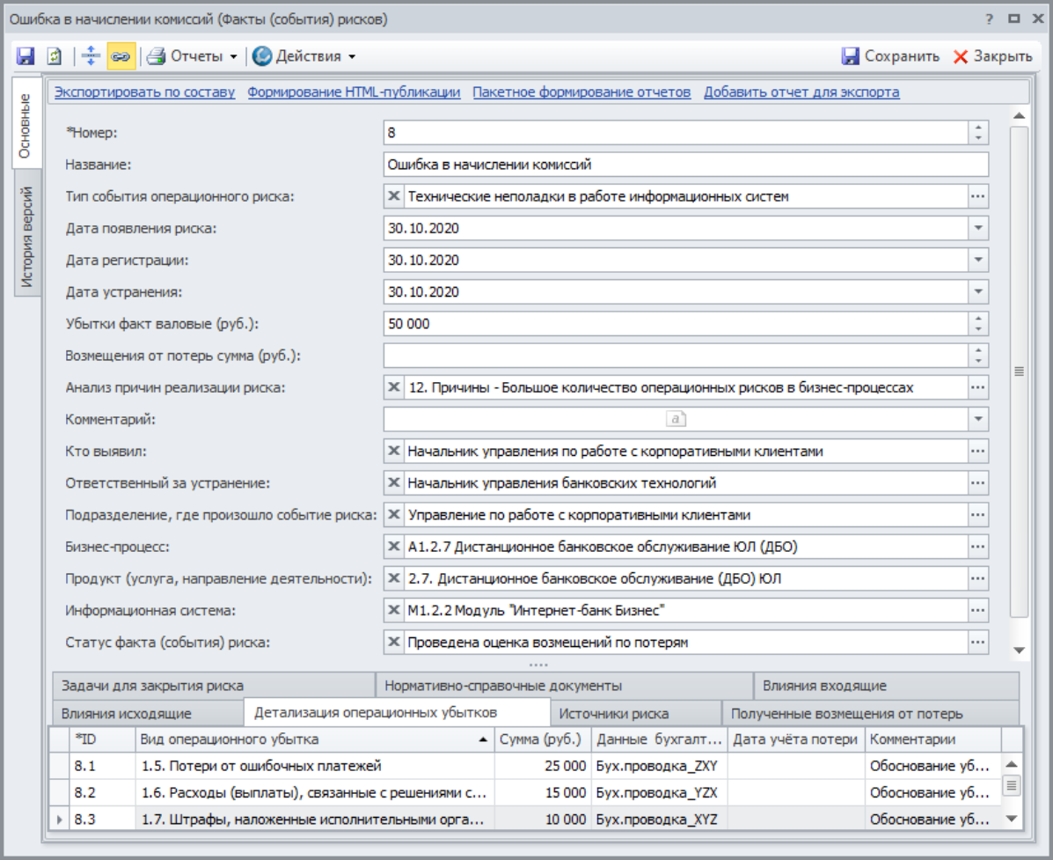 Данная группа включает: идентификация рисков (план), факты (события) рисков (Рис. 5), задачи (предупреждающие и корректирующие действия по рискам), матрицы и карты рисков, показатели (Key Risk Indicators — KRI). Все справочники обычно имеют формат иерархических каталогов (реестров), которые ведутся в Microsoft Excel или специализированных программных продуктах, например Business Studio [2]. А графические модели и матрицы позволяют наглядно отобразить и изучить необходимую информацию по рискам для быстрого принятия решений и системного понимания.