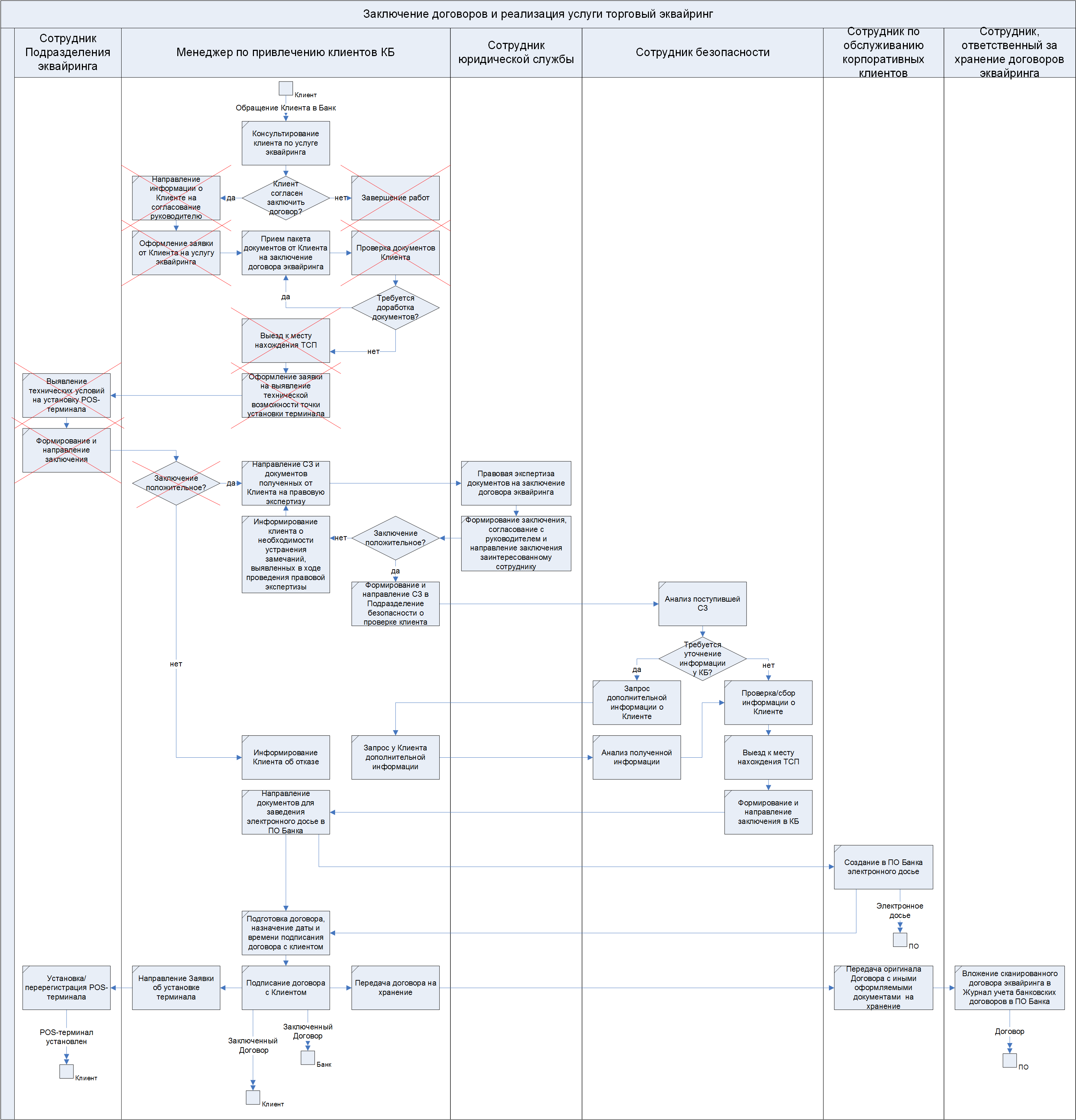 Так, при поступлении в банк документов для заключения договора торгового эквайринга не осуществлялась их первичная проверка, и замечания сообщали в течение двух рабочих дней; сотрудники юридической службы и службы безопасности проверяли документацию последовательно; выезд в